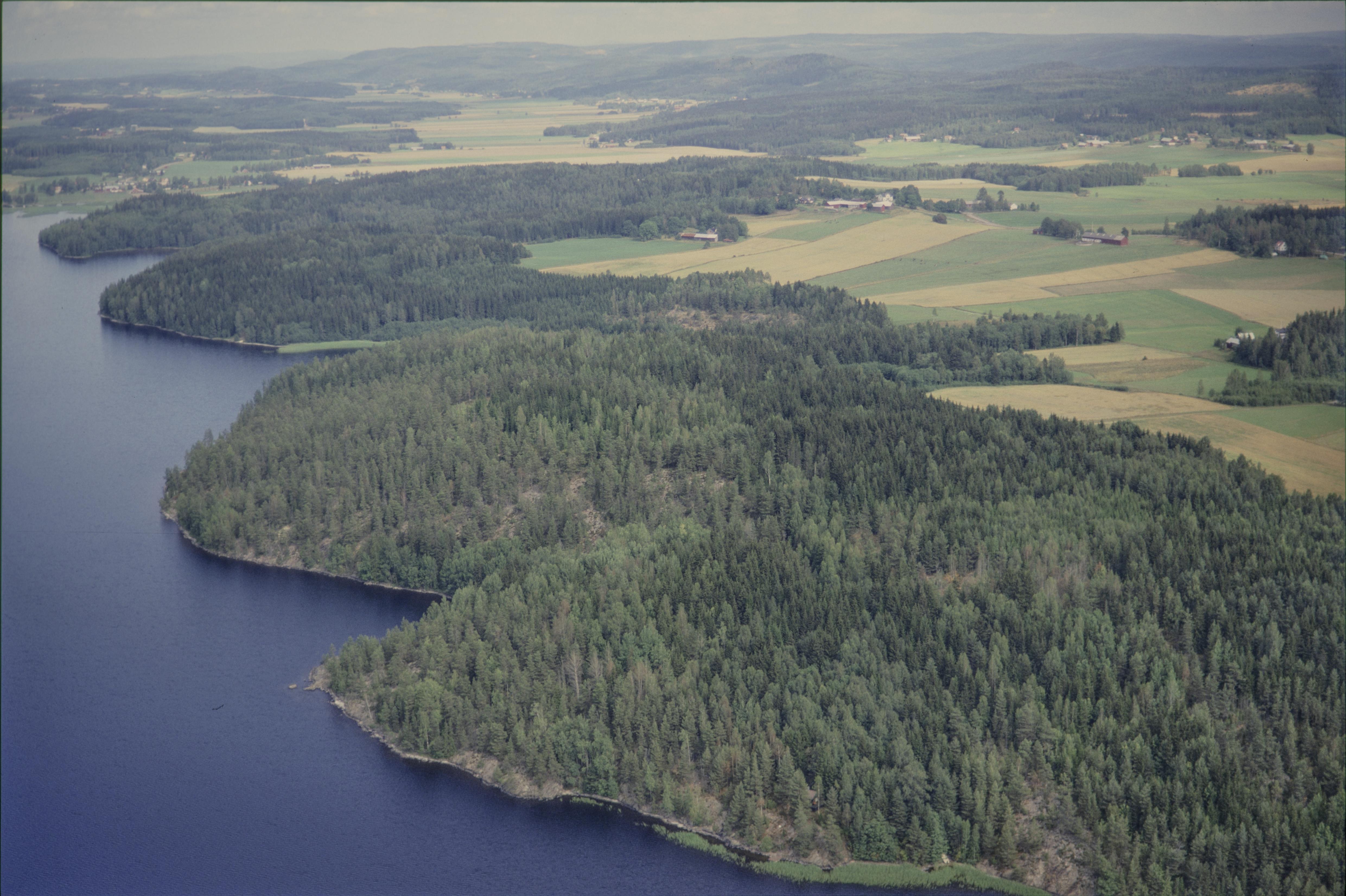 Smedsby vid sjön Mellan-Fryken. Vid bildens mitt bytomt RAÄnr Östra Ämtervik 296:1 vid gården Vesta. Bilden är tagen mot (väderstreck): NNV