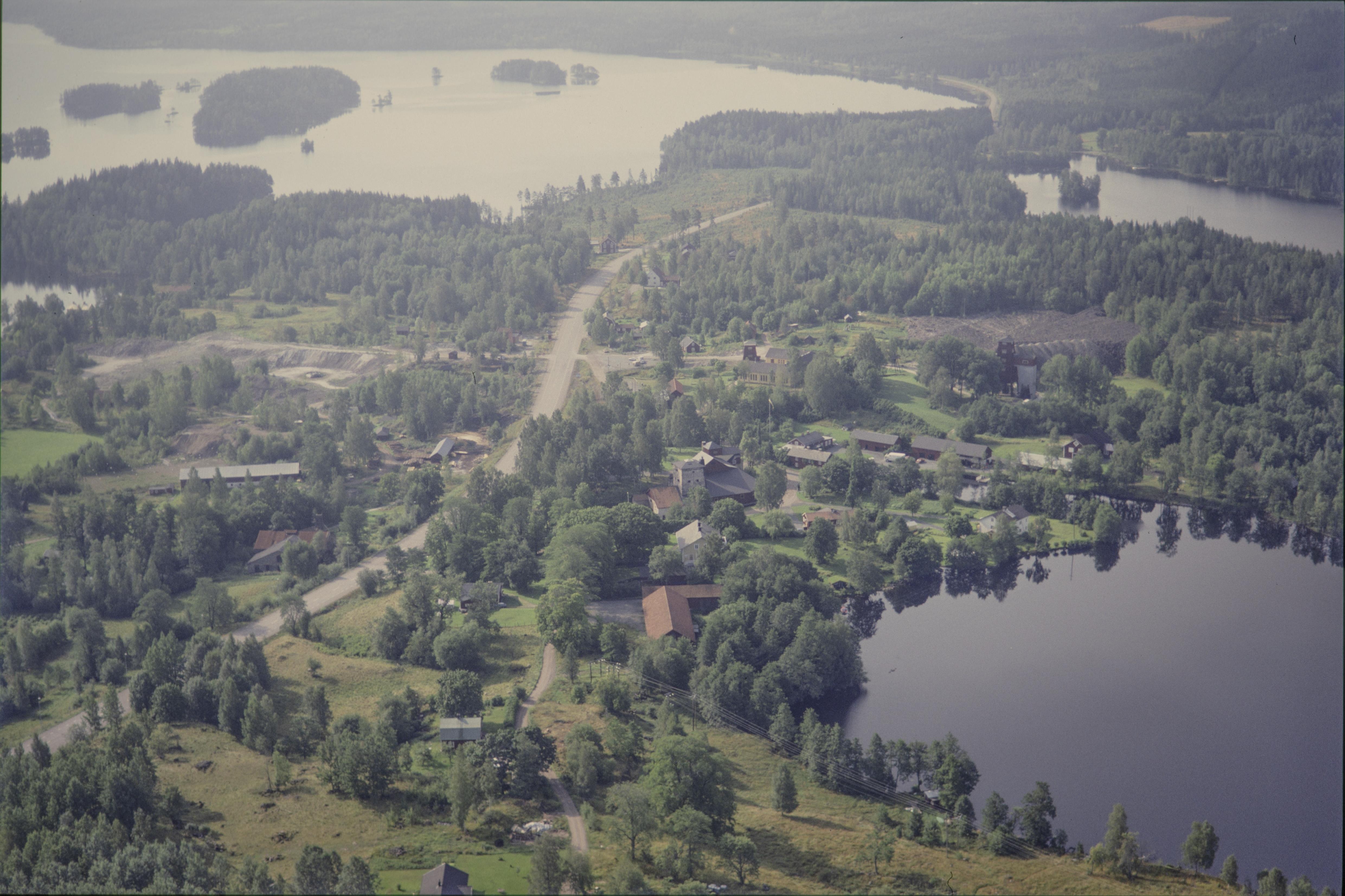 Långban by mellan sjöarna Hyttsjön (uppe till vänster) och Långban (till höger). Vid bildens mitt gruvområde RAÄnr Färnebo 548:1-6 med herrgården John Ericssongården, byggnadsminne RAÄnr Färnebo 557:1. Till höger Tibergs uddes naturreservat. Bilden är tagen mot (väderstreck): S