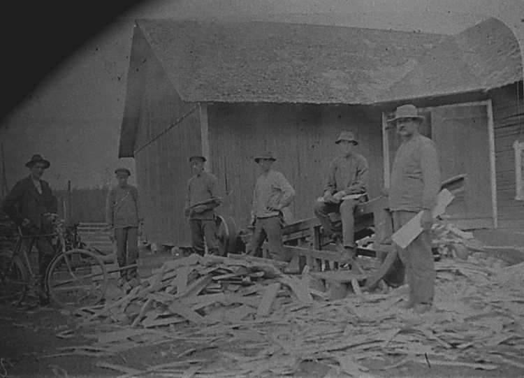 Titel: Spånhyvling i Bäserud. Fr.v: 1. Johan Jonsson, Bålerud (bror till Hjalmar J). 2. Einar Persson, Lindås 3. Gusten Persson, Backen 4. Bror Karlsson, Bålerudshed 5. Bertil Jansson, Bålerud 6. Ludvig Johansson, Bäserud Reprofotograf: Gunnar Berggren.
