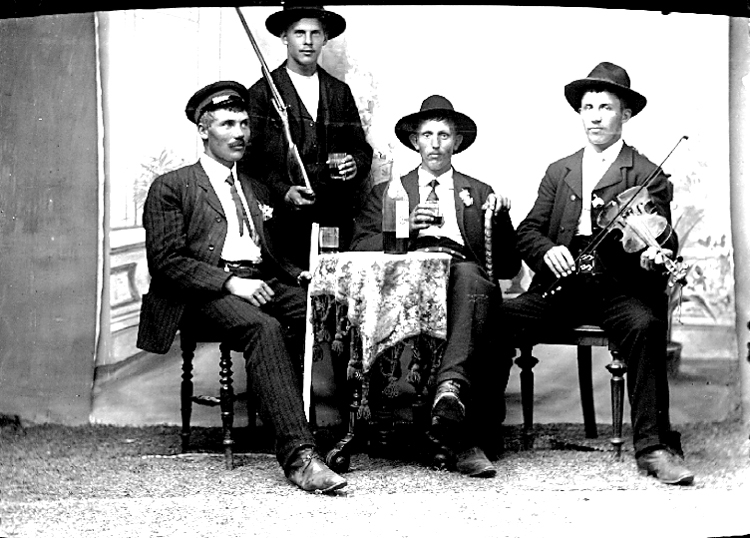 Ateljé. Tre herrar med gevär, fiol, flaska och glas.