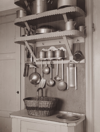 Några köksredskap hänger över en mindre arbetsbänk klädd med bleckplåt.
