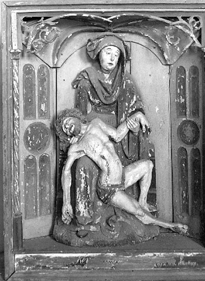 Pietà , framställning av den sörjande jungfru Maria, sittande med den döde Kristus i sitt knä. Motivet har sin bakgrund i senmedeltidens passionsmystik och uppstod i Rhenområdet i början av1300-talet. Det blev därefter vanligt i både måleri och skulptur. En ensam sörjande Maria kallas mater dolorosa.