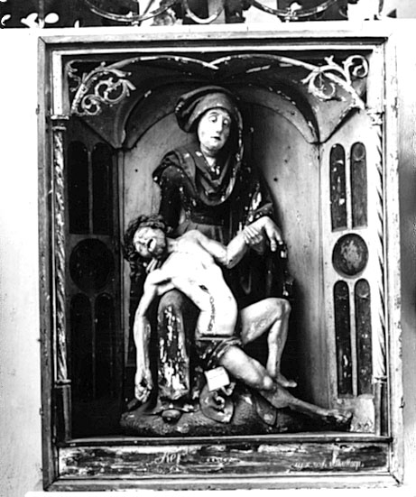 Pietà , framställning av den sörjande jungfru Maria, sittande med den döde Kristus i sitt knä. Motivet har sin bakgrund i senmedeltidens passionsmystik och uppstod i Rhenområdet i början av1300-talet. Det blev därefter vanligt i både måleri och skulptur. En ensam sörjande Maria kallas mater dolorosa.