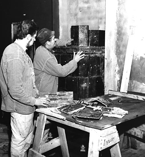 Kakelugnsmakaren Hjoberg från Frändefors, sätter upp kakelugn i biblioteket.
