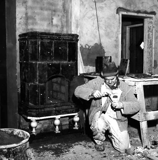 Kakelugnsmakaren Hjoberg från Frändefors, sätter upp kakelugn i biblioteket.