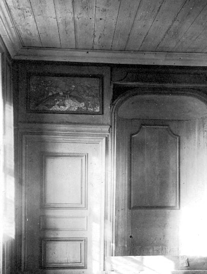 Dörr och panel i gamla stenbyggnadens övre våning.