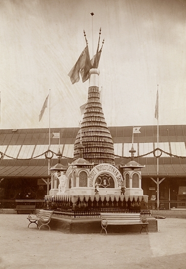 Tornet" uppbyggt av ölflaskor.