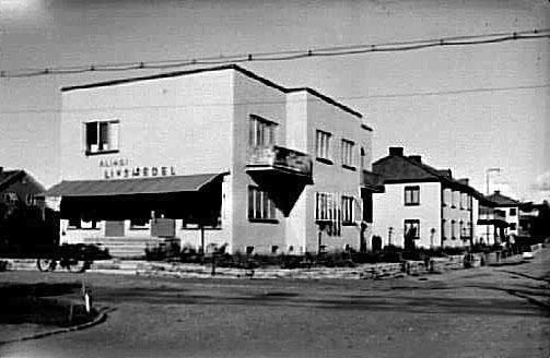 Affärs-o bostadshus med livsmedelsaffär på gaveln mot Kinnekullegatan.