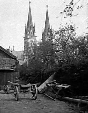 GÅRDSMILJÖ MED HÄSTANSPÄND ARBETSVAGN I BAKGRUNDEN DOMKYRKAN.