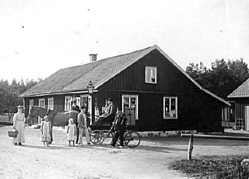 LANTHANDEL MED HÄSTSKJUTS I FÖRGRUNDEN, SANNOLIKT TILLHÖRIG EN HANDELSRESANDE DÅ VAGNEN ÄR LASTAD MED ETT ANTAL KOFFERTAR. 1890-1900.