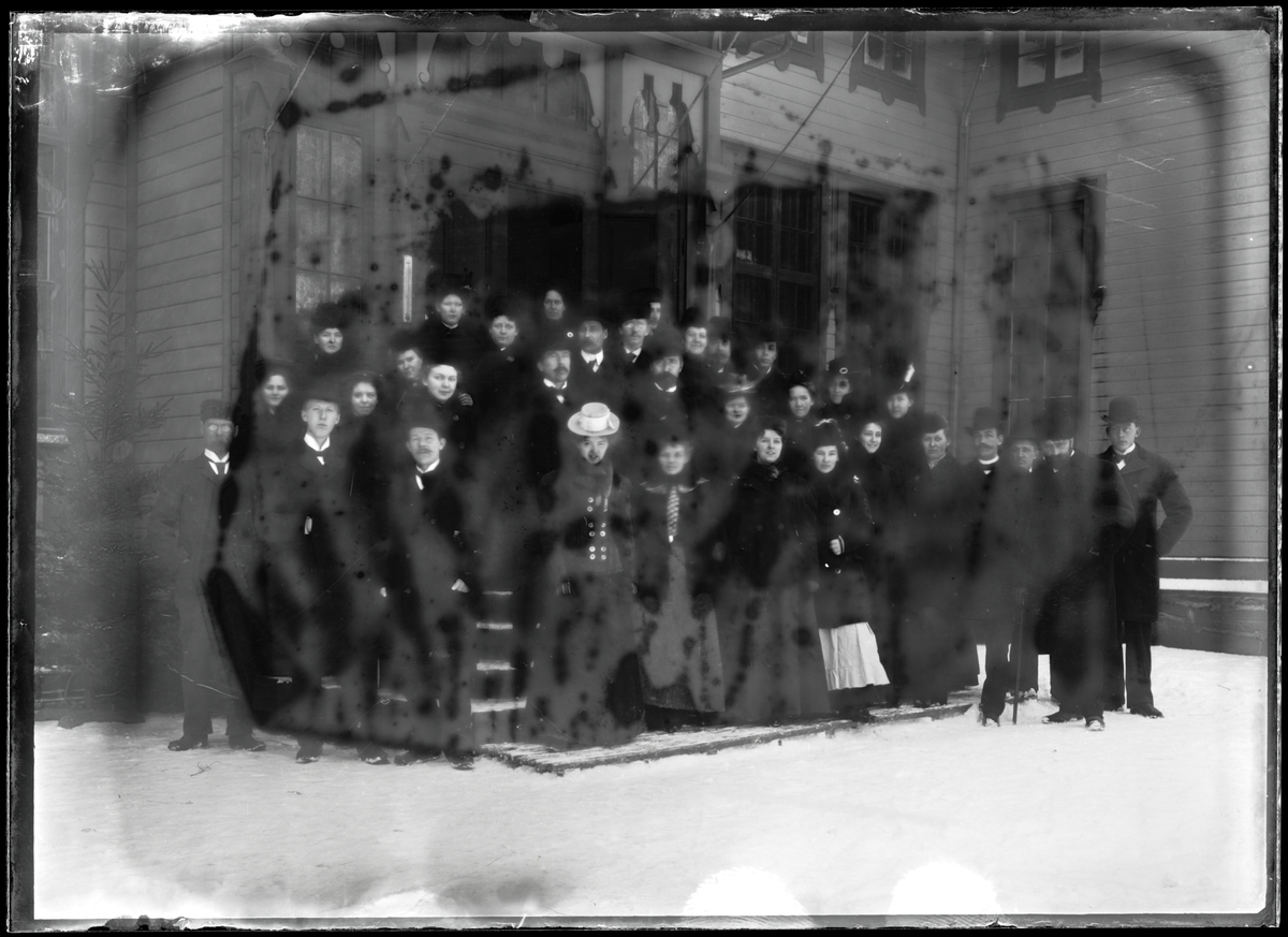 Grupp framför hus på Nääs Slöjdlärarseminarium