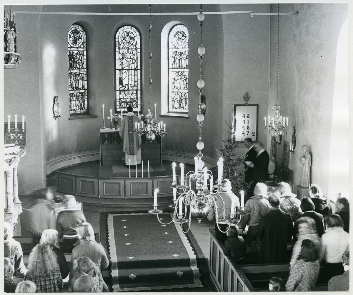 Interiör av Tillberga kyrka med präst och kyrkobesökare, 1979.