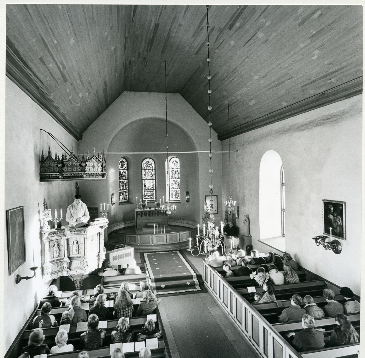 Interiör av Tillberga kyrka med präst och kyrkobesökare, 1979.