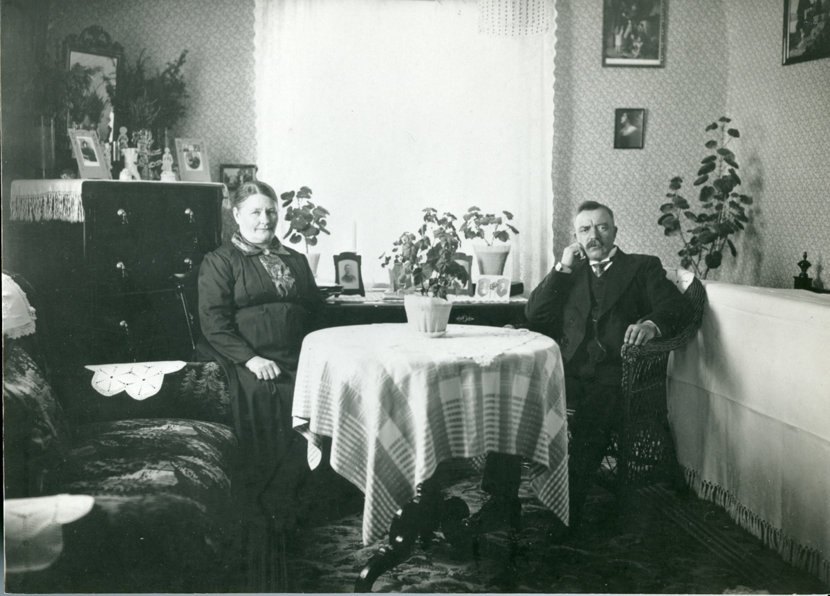 "Gårdskarlen" Albert Karlsson med hustrun Hulda, i arbetarbostaden vid Västerås Hytta. 1920-tal.