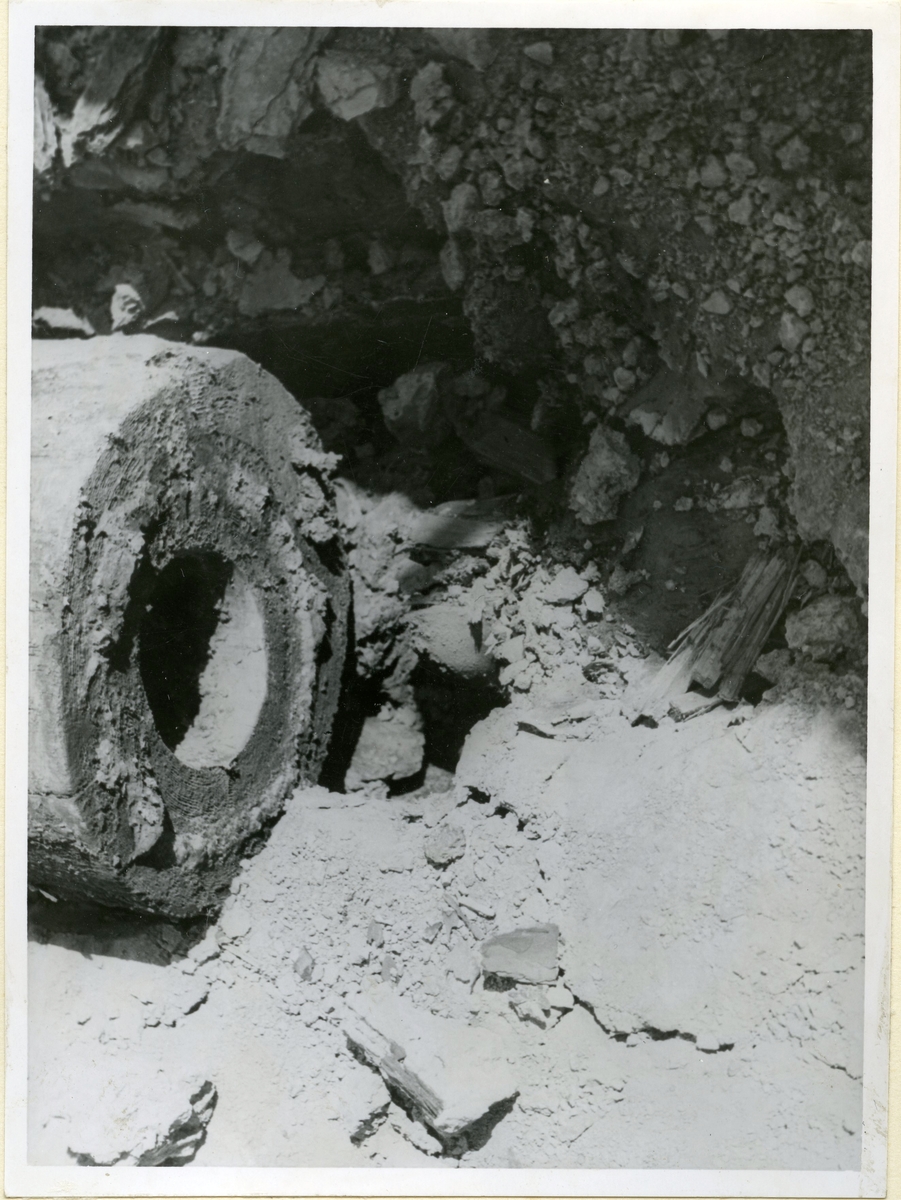 Vattenledning av trä, funnen vid grundgrävning för lasarettet på Hemdal, 1933.