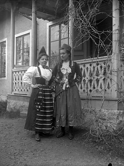 Två kvinnor i folkdräkt, vid prästgården, Lillhärad.
