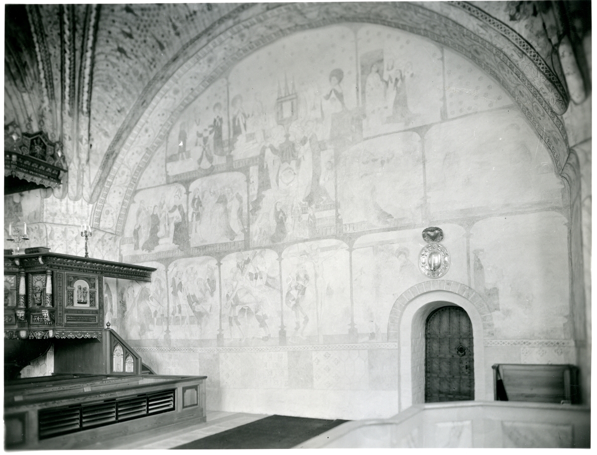 Väggparti med kalkmålningar i norra delen av Tortuna kyrka, 1933.