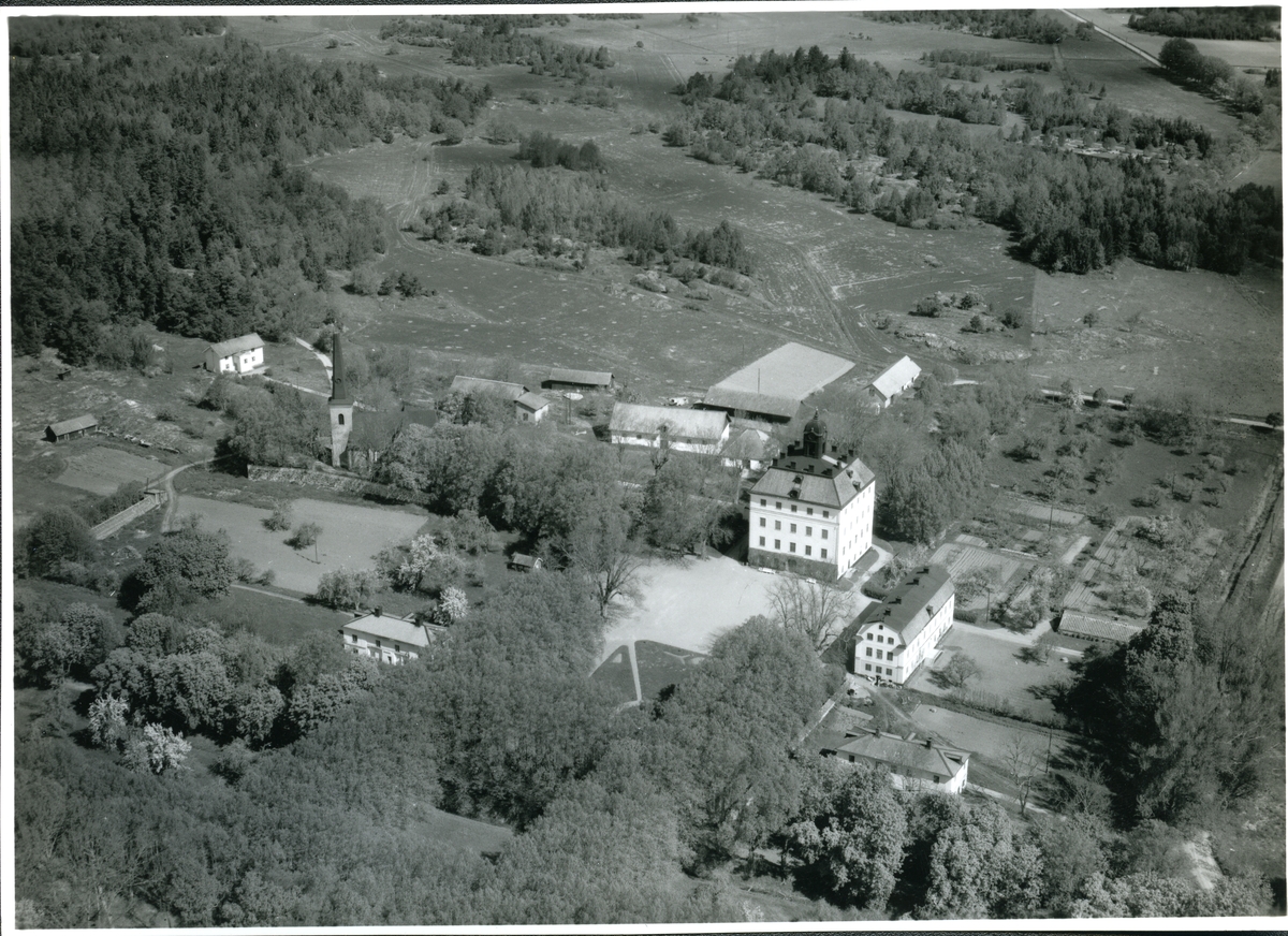 Flygfoto över Ängsö slott och Ängsö kyrka