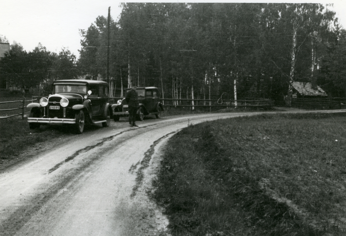 Två bilar står vid sidan av landsväg.