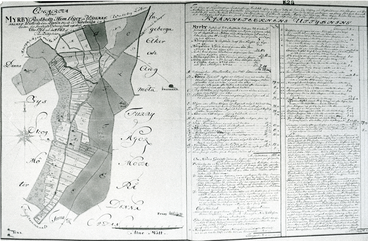 Karta från 1766 och 1767, över "Myrby Rustholls Hem Ägor".