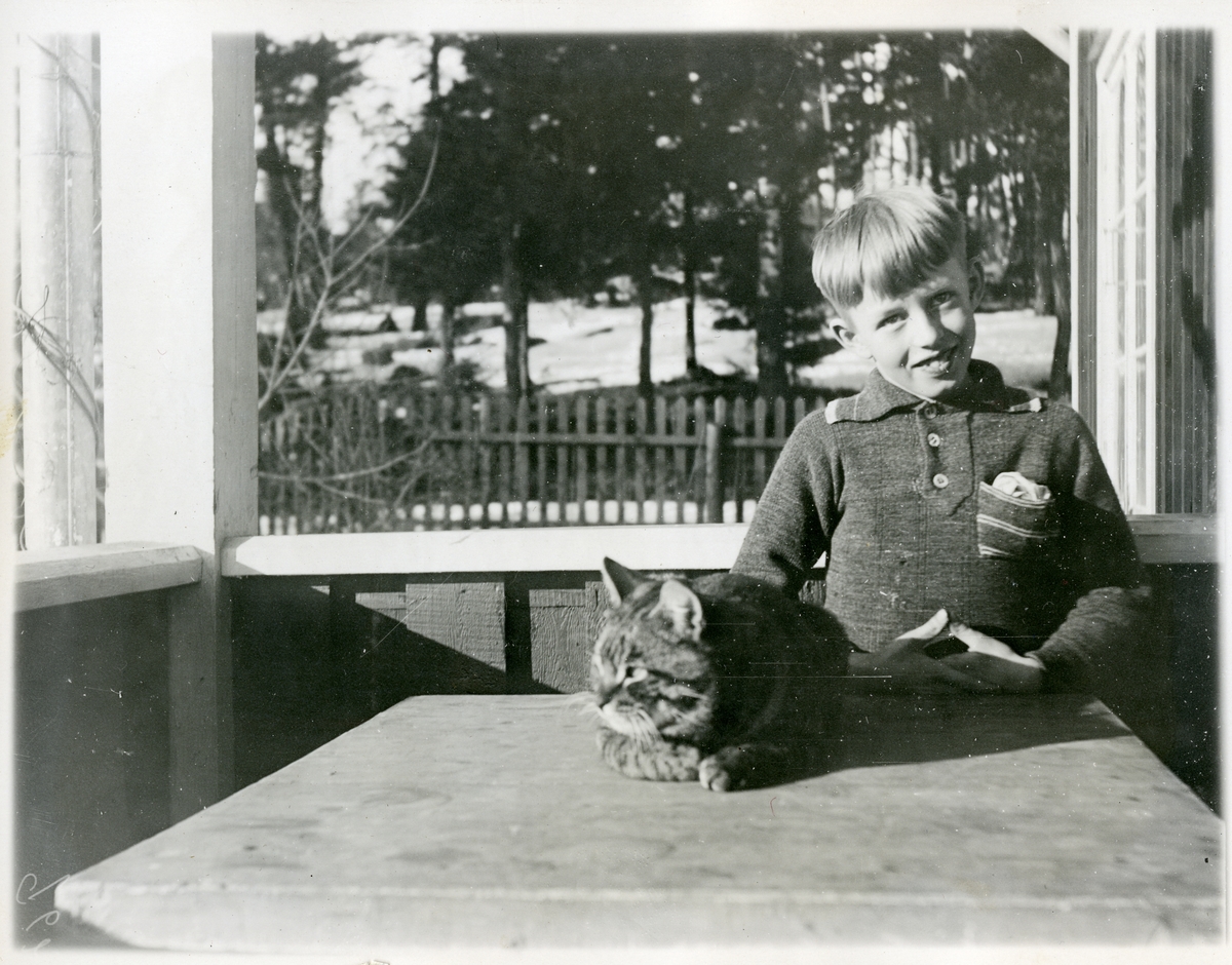 "Olle och katten". Pojke på verandan med katt på bord. Ektorp Huvudsta, Solna.
