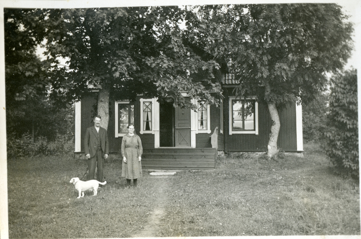 Man och kvinna med hund, stående utanför bostad. Träd.