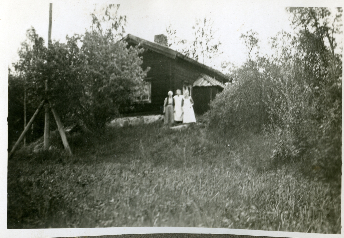 "Farmor, Ingeborg och Hulda". Stående vid gaveln av soldattorpet.
