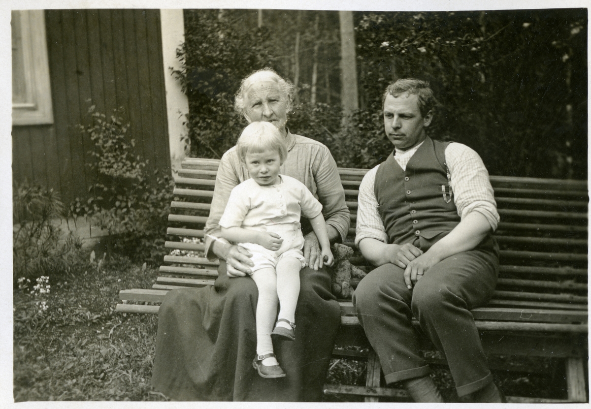 "Farmor, Nils och Gösta". Sittande på trädgårdsbänk framför huset.