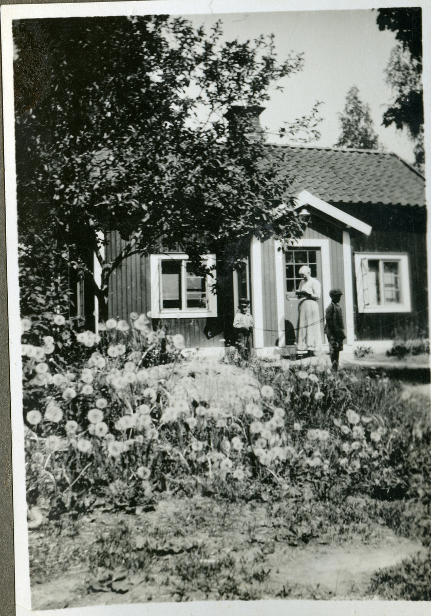 "Farmors stuga". Kvinna och pojke står framför huset. Blomsterrabatt i förgrunden.