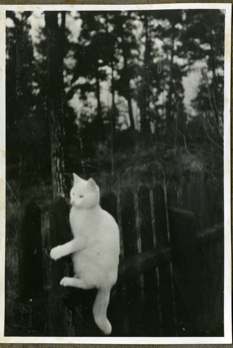 "Vår katt". Vit katt på staket.
