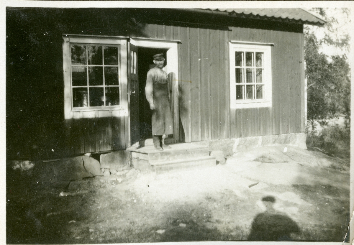 "Farfar Nils Gustaf Bergling vid verkstaden". Mannen står i dörröppningen till verkstaden ev. i Fillinge, Medåker socken.