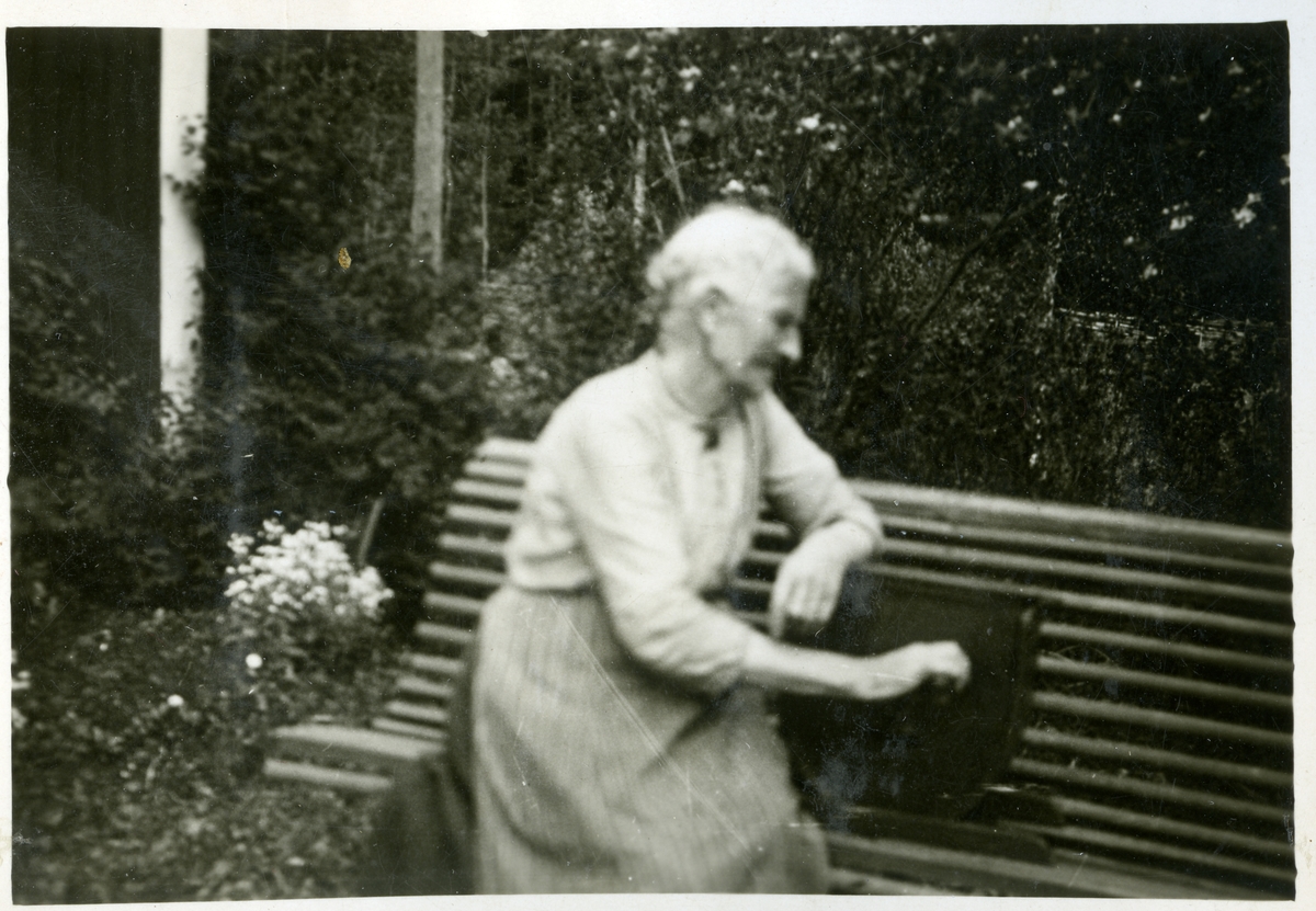 "Farmor". Johanna Bergling sitter på trädgårdsbänk. Ev. Fillinge, Medåker socken.