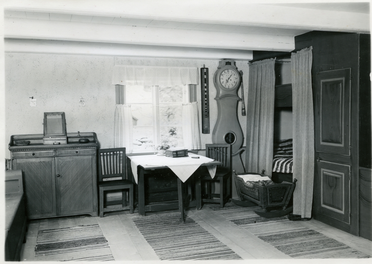 Interiör från Huddunge hembygdsgårds kök. Med golvur, vagga m.m.