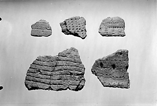 Lerskärvor från lerkärl av gropkeramik från stenåldern. Hubbo socken, Fågelbacken, Västerås.