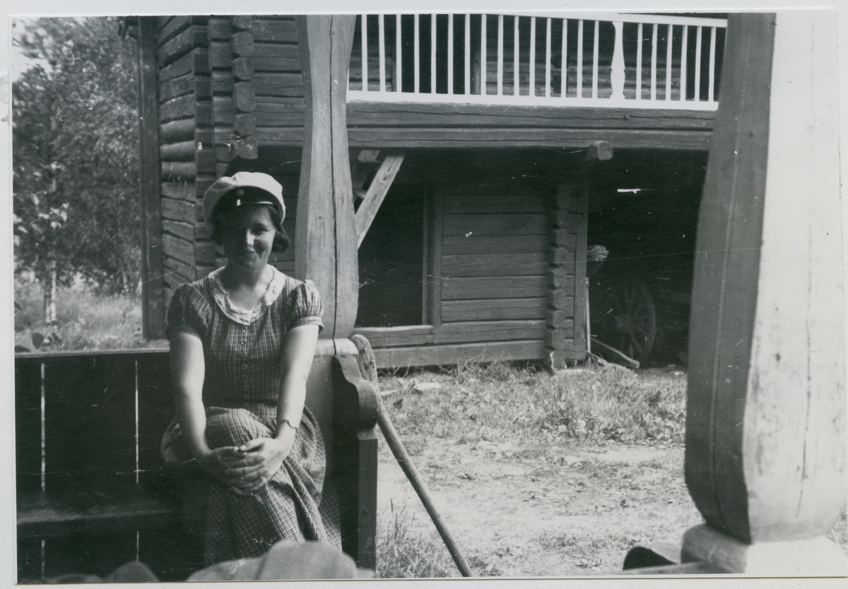 Möklinta Hembygdsförening. Gammelgården, 1933, Fröken G. Berlin på Gammelgårdens veranda.