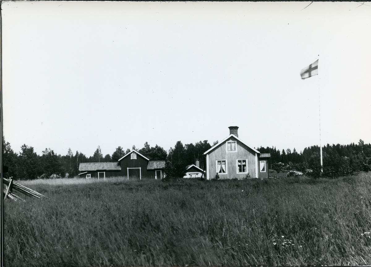 Gård med bostad, ekonomibyggnad och flagga. Början 1900-talet.