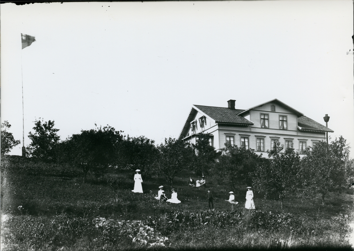 Herrskapsfolk i trädgården utanför herrgård. C:a 1900.
