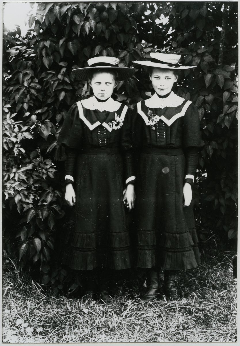 "Uppklädda framför kameran". Två flickor med hattar. C:a 1900.