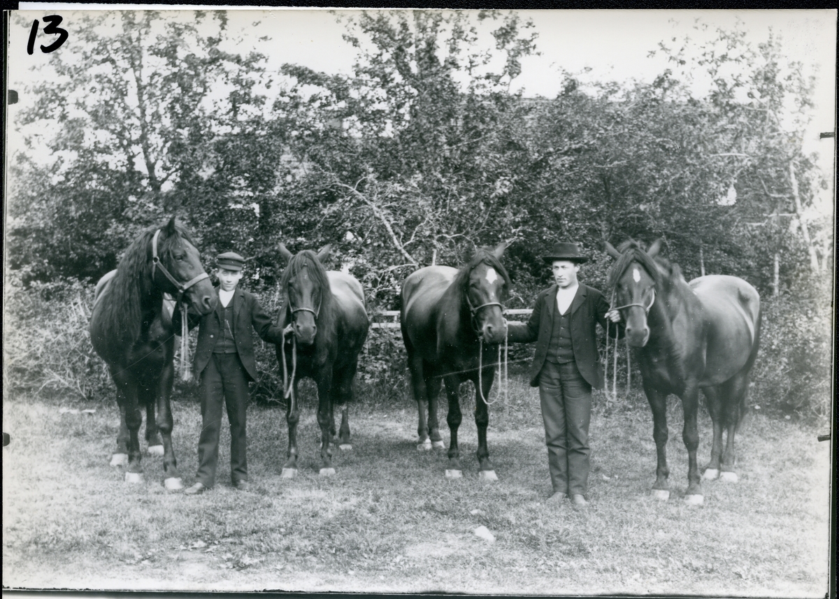 Två män håller två hästar var. Början 1900-talet.