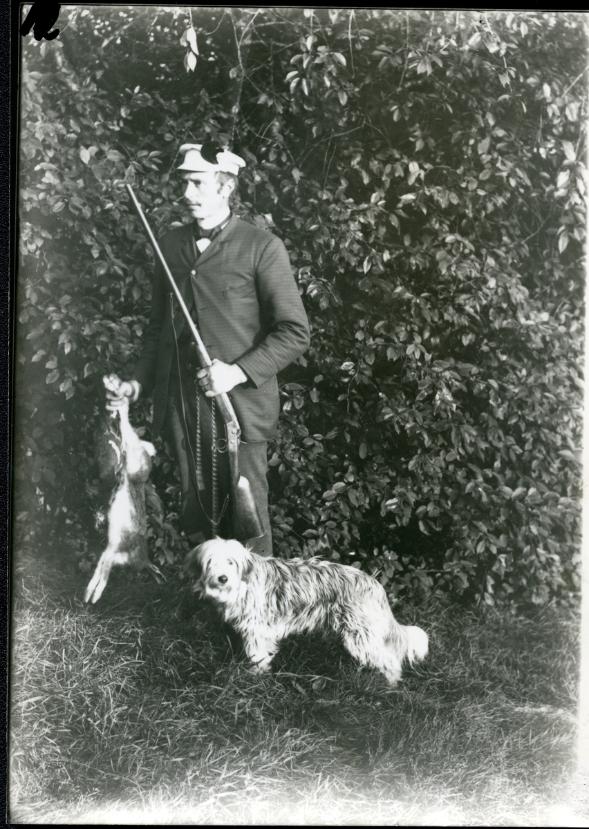 Man med hund, bössa och jaktbyte. Början 1900-tal.