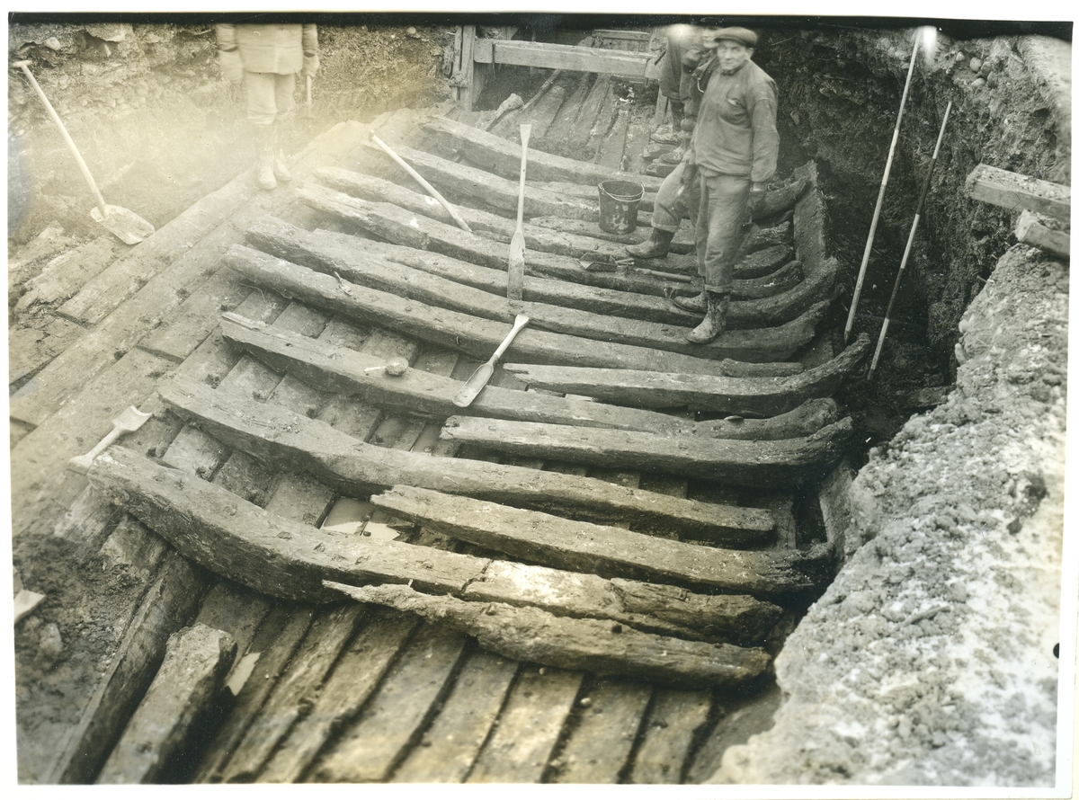 Arbetsbild från utgrävningen av båtfyndet i Gamla hamnen i Västerås, 1935.