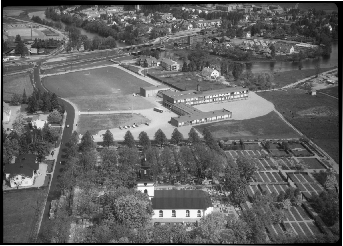 Flygfoto över Tunboskolan och Kolbäcks kyrka, Kolbäck.