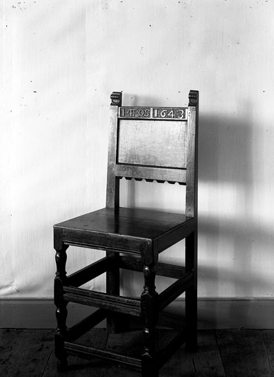 Stol från 1643, inköpt för Herrgårdens möblering, Vallby friluftsmuseum, Västerås.