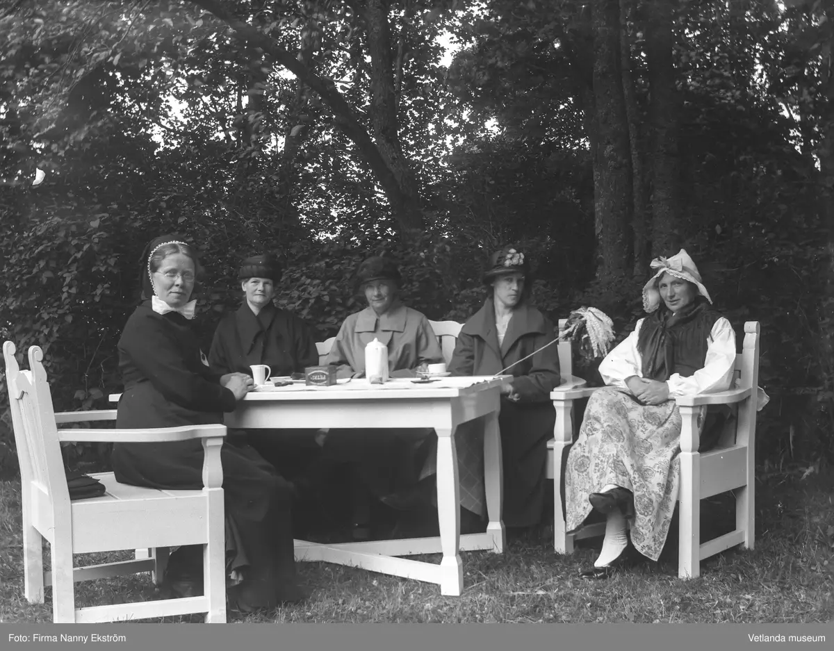 Damer vid ett kaffebord, utomhus.