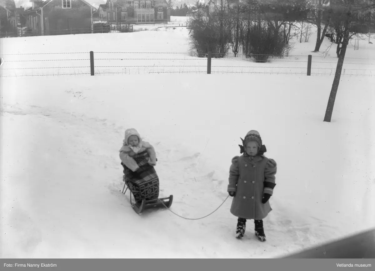 Två barn med en kälke, vy mot stationsgatan Vetlanda
