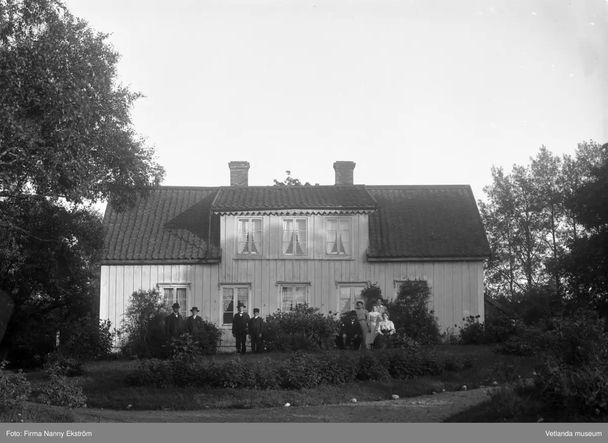 Nilsgården (Berga) i Sandåkra. Framför huset står Carl Petter Karlsson och hustrun Matilda Sofia Johansdotter med familj.
