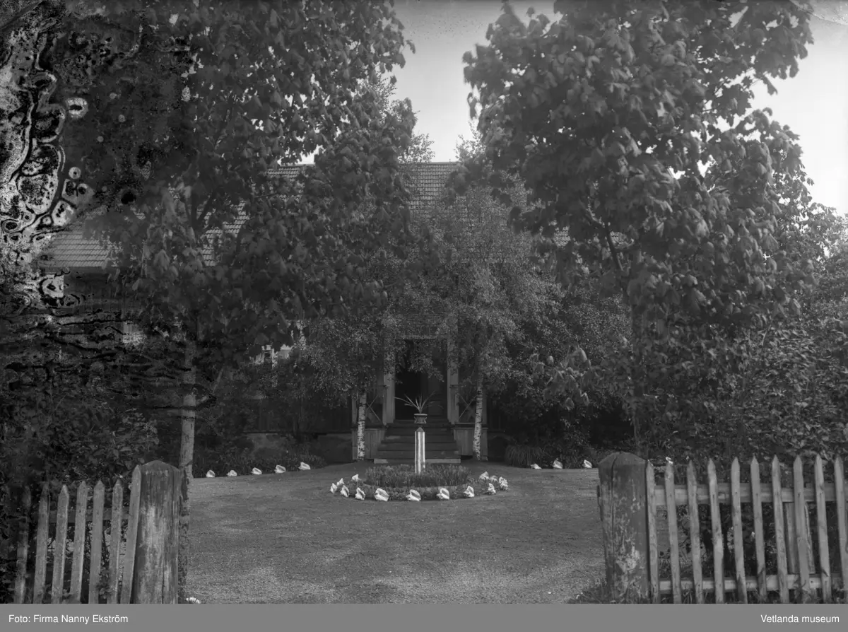 Hus skymt av träd. Trädgårdslanden är kantade med stora snäckor. Oidentifierat.