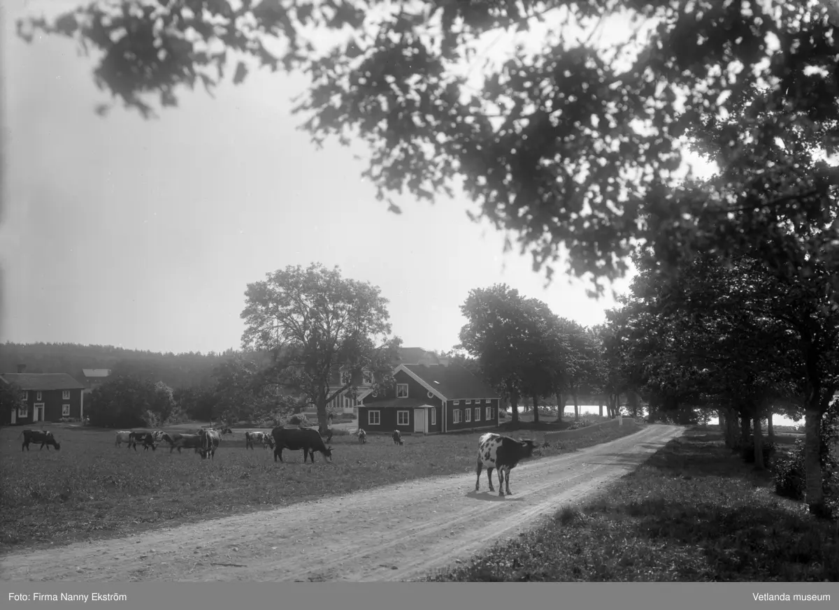 Oidentifierad utsikt över åkrar och en gård ner mot en sjö.
