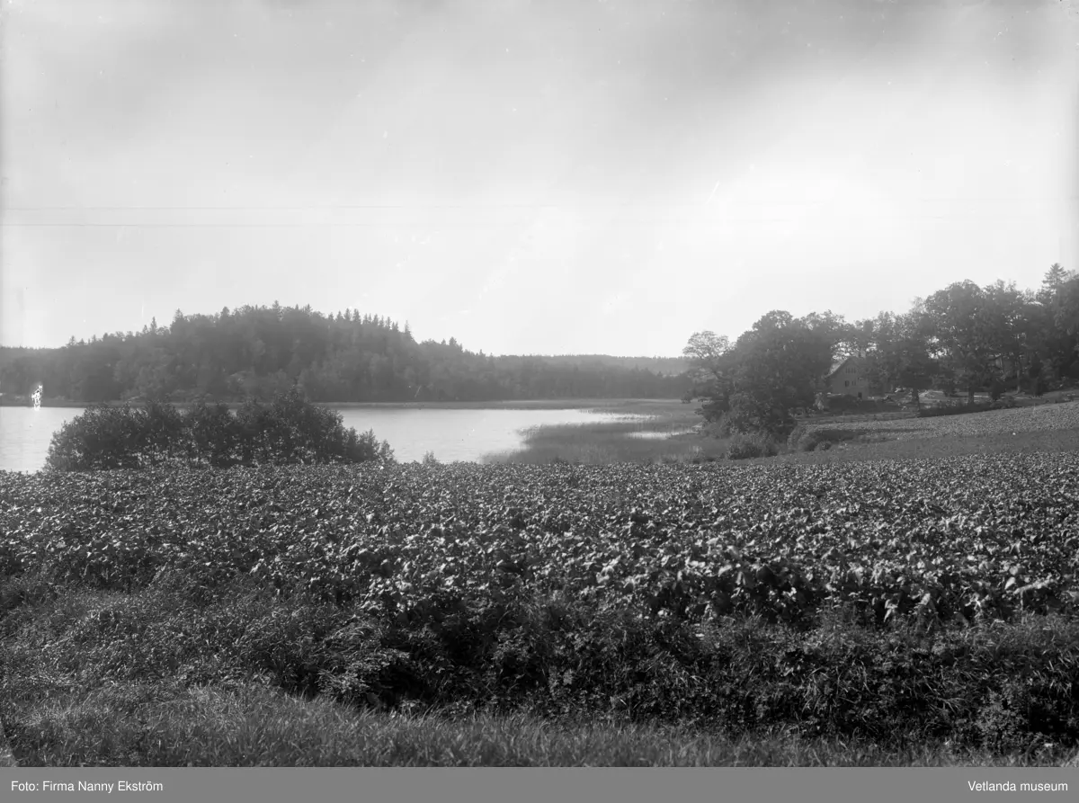 Oidentifierad utsikt över åkrar och en gård ner mot en sjö.
