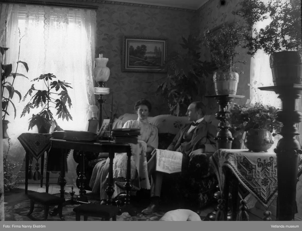 Man och kvinna i sallong. Mannen läser Östgöta corren.